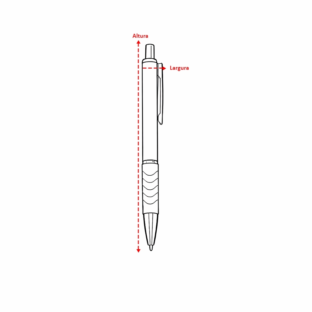 Caneta metálica com detalhe emborrachado próximo à ponta. Conta com acionamento por clique e carga esferográfica azul de 1.0mm.